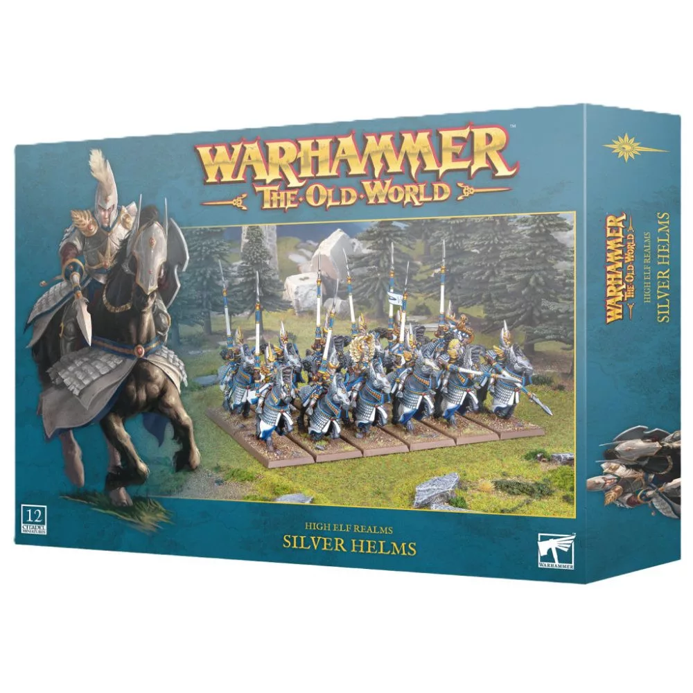 This multipart plastic kit builds 12 Silver Helms, elite heavy cavalry for your High Elf Realms armies in games of Warhammer: The Old World. These mighty mounted warriors and their horses are clad in gleaming scale mail, with tall shields and lances for riding down their quarry. They are ideal for leading charges and smashing through enemy lines.
