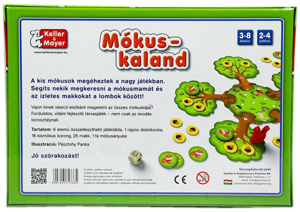 Összerakjuk a táblát, kiosztjuk a játékosszámnak megfelelően a mókus korongokat, a mókusmamát az egyik fára, a 4 makkot a többire tesszük. A játékosok sorban dobnak a különleges kockával, és a rajta szereplő ábraáltal jelzett cselekedetet hajtják végre - letesznek egy makkot, leteszik egy kismókusukat egy makkra, mozgatják a mókusmamát. A játék célja, hogy minél előbb az összes kismókusunk letehessük, azaz megetessük őket.Tartozékok: 6 elemű összeilleszthető játéktábla1 rajzos dobókocka16 kismókus korong25 makk1 fa mókusanyuka és a játékszabályAjánlott kor: 3-8 év Játékosok száma: 2-4Játékidő: 20 perc
